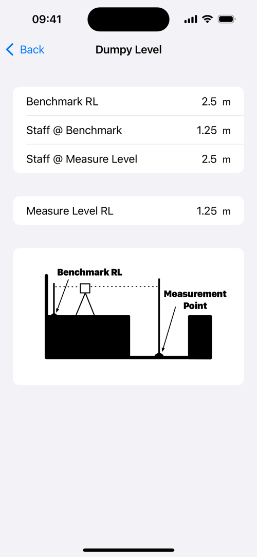A calculadora mostrará instantaneamente seu nível reduzido. Todos os cálculos seguem métodos topográficos padrão e fornecem resultados precisos segundo os padrões da indústria.